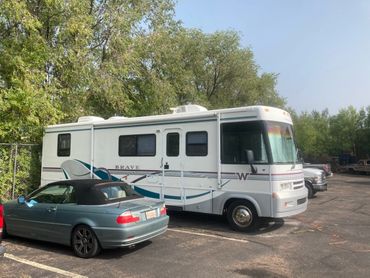 Spots are uncovered. Sizes vary up to 32 feet (RV shown is 32 feet long x 8 feet wide).
